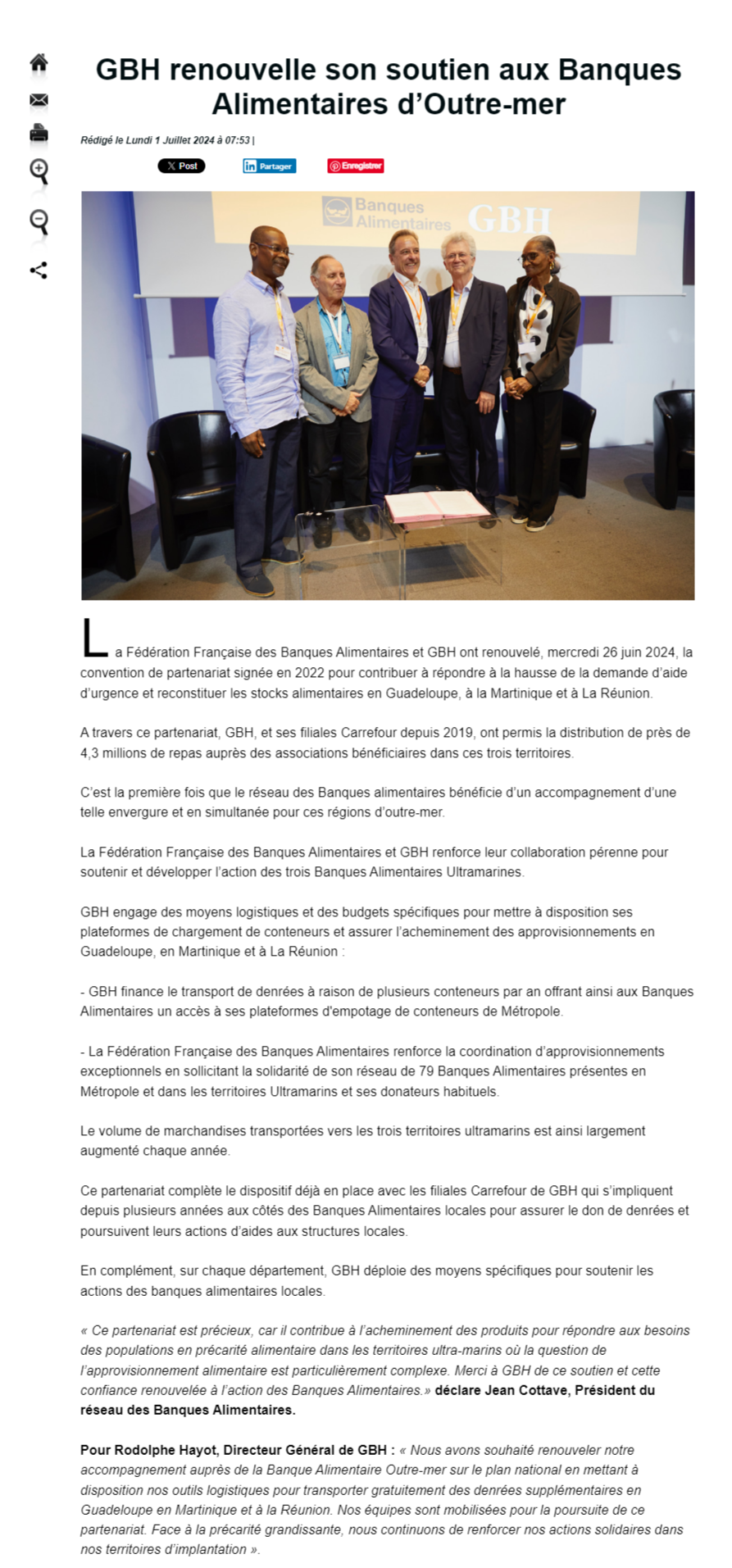 La Fédération Française des Banques Alimentaires et GBH ont renouvelé, mercredi 26 juin 2024, la convention de partenariat signée en 2022 pour contribuer à répondre à la hausse de la demande d’aide d’urgence et reconstituer les stocks alimentaires en Guadeloupe, à la Martinique et à La Réunion.
