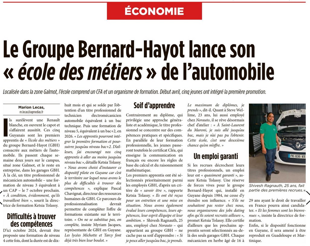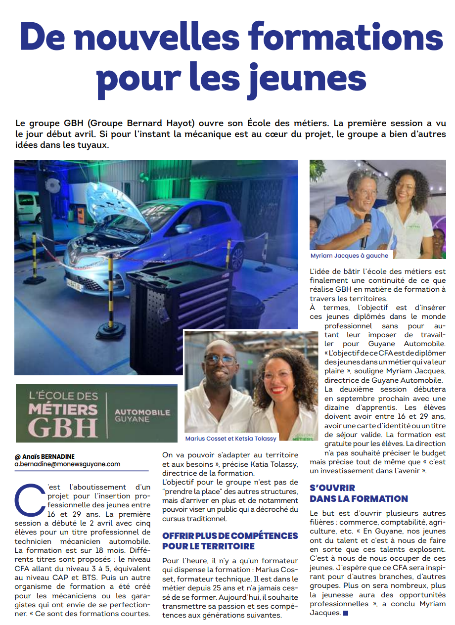 « La Guyane française est confrontée à des taux de chômage élevés, en particulier parmi les jeunes. Nous souhaitons contribuer à faciliter l'accès à la formation professionnelle et à l’emploi. L’école des métiers incarne les valeurs de GBH pour la promotion et l’insertion des jeunes. Nous nous engageons à former les candidats dans nos ateliers avec les mêmes équipements que dans un garage sur des véhicules de dernières générations avec des formateurs qualifiés et passionnés. En choisissant d’intégrer l’école des métiers GBH, les jeunes auront l’assurance d’acquérir rapidement une expertise technique adaptée aux exigences du métier et d’intégrer le monde dynamique de l’automobile. » explique Myriam Jacques,